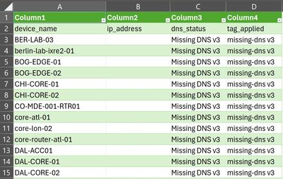 The auditv01110 workflow produces a structured CSV artifact that captures the delta between the Source of Truth and the active DNS environment. Each record identifies the device, its IP address, and the specific synchronization status—such as In Sync or Missing DNS. This provides infrastructure teams with a verifiable audit trail and a direct list of required remediations, ensuring that naming conventions and record accuracy are maintained at scale.